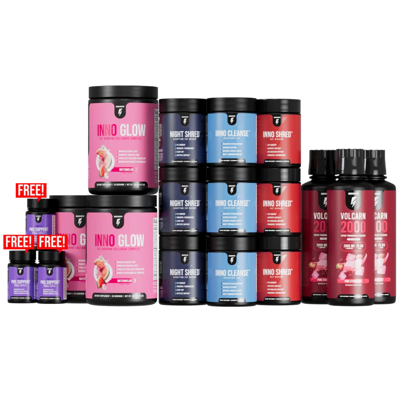 3 Free Bottles of Complete PMS Support 1 Free Inno Supps Shaker Bottle 1 Free Inno Supps Frother Burn Fat While Supporting Skin Texture* Beat Bloating and Flush Out Waste* Boost Metabolism 24/7*