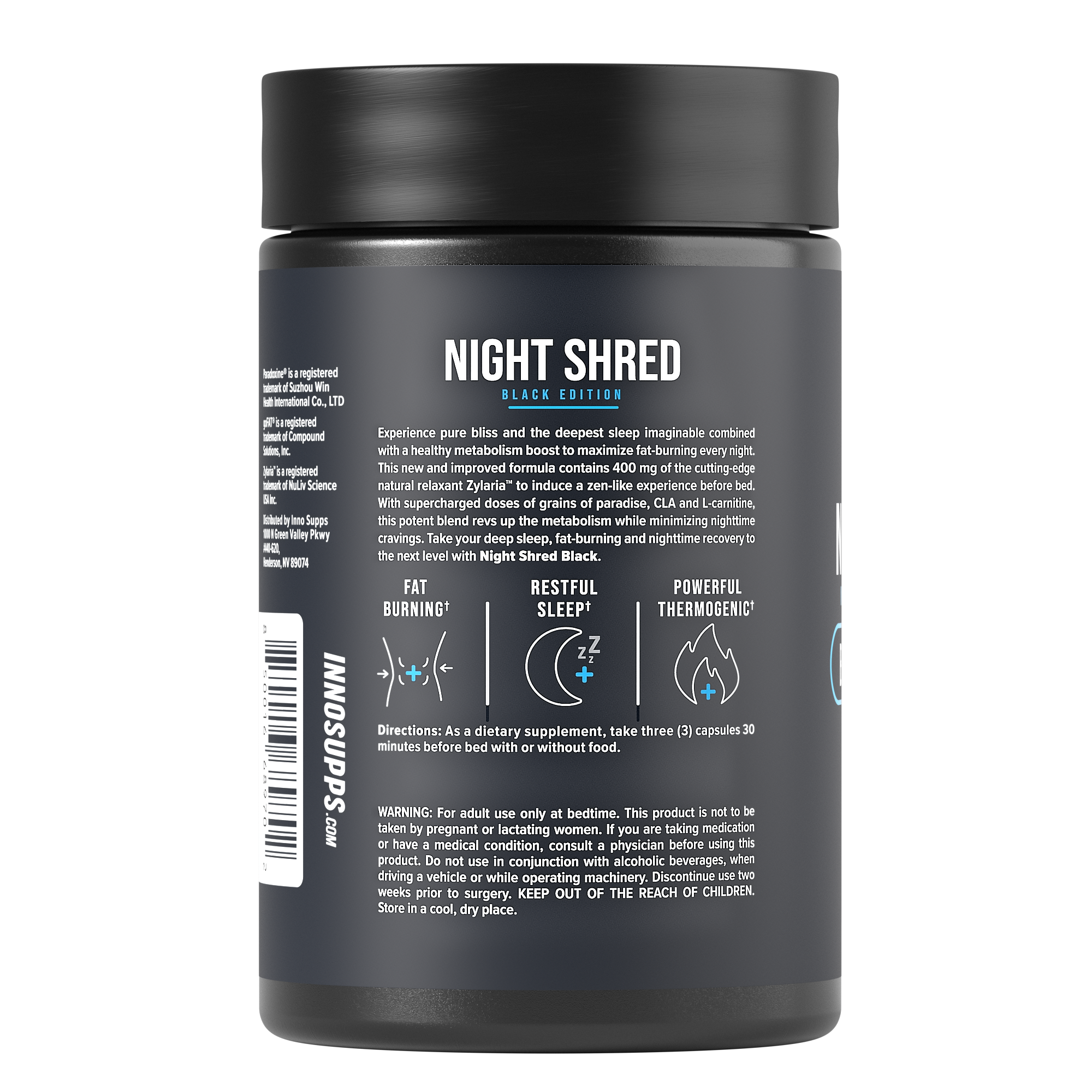Night Shred Black contains the most revolutionary and cutting-edge sleep-inducing ingredient, Zylaria, along with powerful metabolism-boosting ingredients to curb nighttime cravings and accelerate the fat‐burning process.