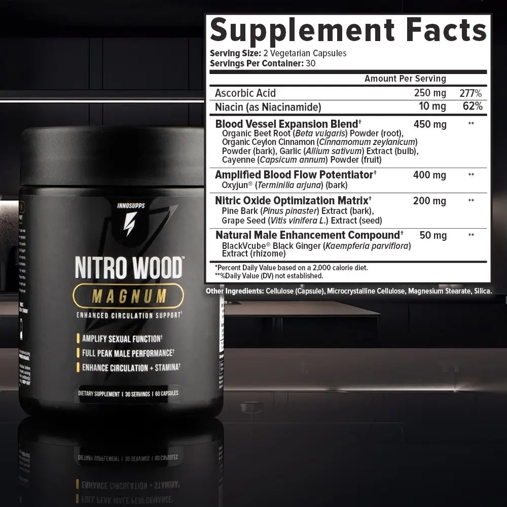 Nitro Wood™ Magnum is formulated with patented natural ingredients clinically shown to help enhance length and girth. Prime your body for peak performance with supercharged circulation and improved erectile response for fuller firmer erections on demand and enhanced endurance.