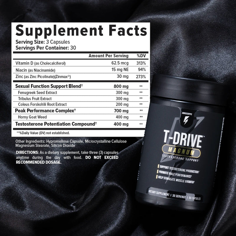 Testosterone Production* Kick your body's natural testosterone production into overdrive with this clinically supported duo. Some users have reported up to a 450 point increase in testosterone levels when supplementing with this potent herbal combo.* - Supercharge Sex Drive + Performance* The main ingredients in T-Drive Magnum have been used for centuries to enhance sexual function and desire. Recent studies have confirmed their natural ability to help potentiate sex drive, performance and semen volume.*