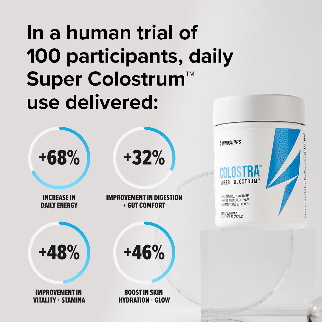 COLOSTRA™ features Super Colostrum™ — a human-optimized form of colostrum enhanced for superior bioavailability. It uses cutting-edge technology to isolate the proteins most beneficial for human absorption, mimicking the bioactives in human breast milk. Additionally, it's protected by a heat- and acid-resistant shield and boosted with AstraGin® to maximize uptake and deliver fast, effective results.