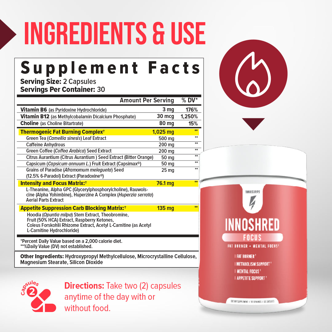 Burning Fat, improving the metabolism, and helping mildly curb your appetite is exactly what Inno Shred Focus is designed for. Our formula contains extremely effective fat burning and metabolism igniting ingredients. We can’t wait to hear about your results after you try it.*