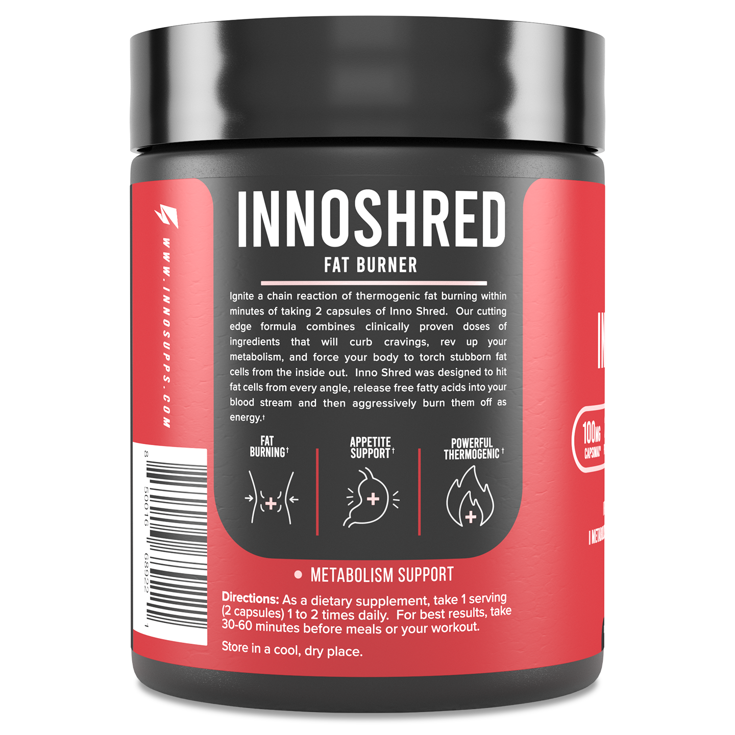 Inno Shred is a powerful thermogenic fat burner that will improve lipolysis 24/7. Taking just 2 capsules a day will result in more calories and stored body fat being burned around the clock.